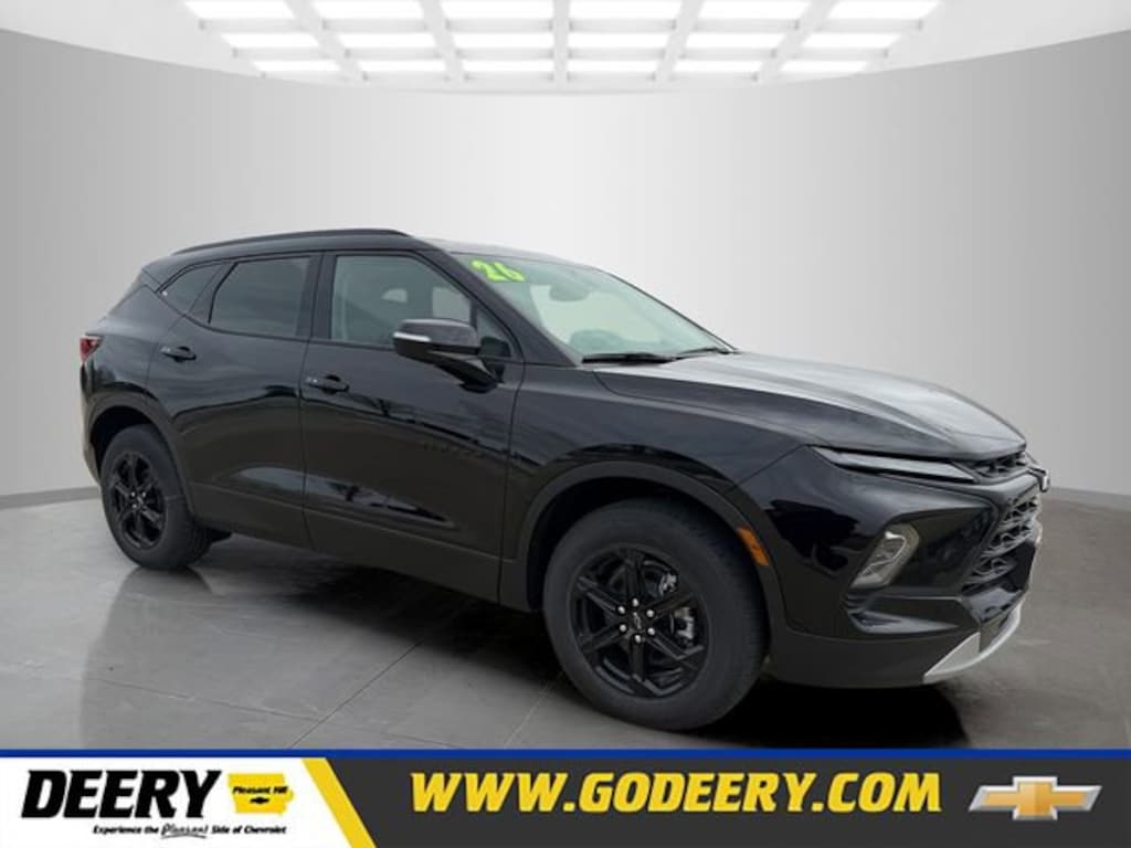 Black 2026 Chevrolet 6 Speakers, 6-Speaker Audio System Feature, 6-Way Power Front Passenger Seat Adjuster, 8-Way Power Driver Seat Adjuster, AM/FM radio: SiriusXM with 360L, Power driver seat, Power steering, Power windows, Remote keyless entry, Steering wheel mounted audio controls, 3.47 Final Drive Ratio, 4-Wheel Disc Brakes, ABS brakes, Air Conditioning, Alloy wheels, Apple CarPlay/Android Auto, Auto High-beam Headlights, Auto-dimming door mirrors, Auto-dimming Rear-View mirror, Automatic temperature control, Brake assist, Bumpers: body-color, Child-Seat-Sensing Airbag, Compass, Delay-off headlights, Driver door bin, Driver vanity mirror, Dual front impact airbags, Dual front side impact airbags, Electronic Stability Control, Emergency communication system: OnStar and Chevrolet connected services capable, Four wheel independent suspension, Front anti-roll bar, Front Bucket Seats, Front Center Armrest, Front dual zone A/C, Front reading lights, Fully automatic headlights, Garage door transmitter, Heated door mirrors, Heated Driver and Front Passenger Seats, Heated front seats, Illuminated entry, Knee airbag, Leather Shift Knob, Leather steering wheel, Low tire pressure warning, Occupant sensing airbag, Outside temperature display, Overhead airbag, Overhead console, Panic alarm, Passenger door bin, Passenger vanity mirror, Perforated Leather-Appointed Seat Trim, Power door mirrors, Power Driver Lumbar Control, Power Liftgate, Power passenger seat, Premium audio system: Chevrolet Infotainment 3 Plus, Radio data system, Radio: Chevrolet Infotainment 3 Plus System, Rear anti-roll bar, Rear reading lights, Rear seat center armrest, Rear window defroster, Rear window wiper, Ride and Handling Suspension, Security system, SiriusXM with 360L Trial Subscription, Speed control, Speed-sensing steering, Split folding rear seat, Spoiler, Stop-Start Engine Control System, Tachometer, Telescoping steering wheel, Tilt steering wheel, Traction control, Trip computer, Turn signal indicator mirrors, Variably intermittent wipers, Voltmeter, Wheels: : 18 Grazen Metallic Aluminum, and Wireless Apple CarPlay/Wireless Android Auto. Blazer 4D Sport Utility LT AWD 2.0L Turbocharged 22/27 City/Highway MPG 9-Speed Automatic with Overdrive AWD Price includes: $1,000 - Exp. 09/30/2026$1,000 DEERY TRADE ASSIST FOR QUAILIFIED TRADES INS. CALL STORE FOR DETAILS
