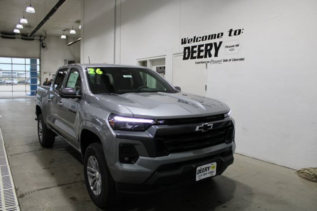Sterling Gray Metallic 2026 Chevrolet LT Convenience Package (120-Volt Bed-Mounted Power Outlet, 120-Volt Power Outlet, Driver Seatback Map Pocket, Dual Rear USB Ports (Charge Only), Evotex Seat Trim, Front LED Fog Lamps, Heated Steering Wheel, LED Daytime Running Lamps, LED Headlamps, LED Stop Tail Lamp, Rear Center Armrest, and Wireless Phone Charging), Preferred Equipment Group 4LT (Automatic Emergency Braking, Chevy Safety Assist, Following Distance Indicator, Forward Collision Alert, Front Pedestrian & Bicyclist Braking, IntelliBeam Automatic High Beam On/Off, and Lane Keep Assist w/Lane Departure Warning), Technology Package (Adaptive Cruise Control, HD Surround Vision, and Rear Pedestrian Alert), Navigation System, 3.42 Rear Axle Ratio, 4-Way Manual Passenger Seat Adjuster, 4-Wheel Disc Brakes, 6 Speakers, 6-Speaker Audio System Feature, 8-Way Power Driver Seat Adjuster, ABS brakes, Air Conditioning, Alloy wheels, AM/FM radio: SiriusXM with 360L, Apple CarPlay/Android Auto, Auto High-beam Headlights, Auto-dimming Rear-View mirror, Automatic temperature control, Black Bowtie Emblem (LPO), Black Nameplates (LPO), Brake assist, Bumpers: body-color, Cloth Seat Trim, Compass, Delay-off headlights, Driver & Front Passenger Heated Seats, Driver door bin, Driver vanity mirror, Dual front impact airbags, Dual front side impact airbags, Electronic Stability Control, Emergency communication system: OnStar, Front anti-roll bar, Front Bucket Seats, Front Center Armrest, Front dual zone A/C, Front License Plate Kit, Front Passenger Seatback Map Pocket, Front reading lights, Front wheel independent suspension, Gloss Black Tailgate Lettering (LPO), Heated door mirrors, Heated front seats, Illuminated entry, Low tire pressure warning, Occupant sensing airbag, Outside temperature display, Overhead airbag, Overhead console, Panic alarm, Passenger door bin, Passenger vanity mirror, Power door mirrors, Power Driver Lumbar Control Seat Adjuster, Power driver seat, Power steering, Power windows, Radio data system, Radio: 11.3 Diagonal Advanced Color LCD Display, Rear reading lights, Rear step bumper, Rear window defroster, Remote keyless entry, Security system, SiriusXM w/360L Trial Subscription, Speed control, Speed-sensing steering, Split folding rear seat, Steering Wheel Mounted Audio Controls, Steering wheel mounted audio controls, Tachometer, Telescoping steering wheel, Tilt steering wheel, Traction control, Trip computer, Variably intermittent wipers, Wheels: 17 x 8 Argent Metallic Aluminum, and Wireless Phone Projection. Colorado 4D Crew Cab LT 2.7L I4 Turbocharged DOHC 16V LEV3-ULEV50 310hp 18/23 City/Highway MPG 8-Speed Automatic 4WD
