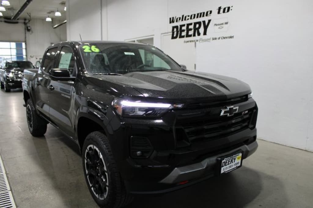 Black 2026 Chevrolet Preferred Equipment Group 4Z7 (Automatic Emergency Braking, Chevy Safety Assist, Following Distance Indicator, Forward Collision Alert, Front Pedestrian & Bicyclist Braking, IntelliBeam Automatic High Beam On/Off, and Lane Keep Assist w/Lane Departure Warning), Technology Package (Adaptive Cruise Control, Bose Premium 7-Speaker Audio System Feature, HD Surround Vision, and Rear Pedestrian Alert), Z71 Convenience Package III (Driver & Front Passenger Ventilated Seats, Driver Memory Settings, Driver Seatback Map Pocket, Heated Steering Wheel, Perforated Leather-Appointed Seat Trim, and Rear Center Armrest), Heated front seats, Navigation System, 3.42 Rear Axle Ratio, 4-Way Manual Passenger Seat Adjuster, 4-Wheel Disc Brakes, 6 Speakers, 6-Speaker Audio System Feature, 8-Way Power Driver Seat Adjuster, ABS brakes, Air Conditioning, Alloy wheels, AM/FM radio: SiriusXM with 360L, Apple CarPlay/Android Auto, Auto High-beam Headlights, Auto-dimming Rear-View mirror, Automatic temperature control, Brake assist, Bumpers: body-color, Cloth/Evotex Seat Trim, Compass, Delay-off headlights, Driver & Front Passenger Heated Seats, Driver door bin, Driver vanity mirror, Dual front impact airbags, Dual front side impact airbags, Electronic Stability Control, Emergency communication system: OnStar, Front anti-roll bar, Front Bucket Seats, Front Center Armrest, Front dual zone A/C, Front fog lights, Front License Plate Kit, Front Passenger Seatback Map Pocket, Front reading lights, Front wheel independent suspension, Heated door mirrors, Illuminated entry, Low tire pressure warning, Occupant sensing airbag, Outside temperature display, Overhead airbag, Overhead console, Panic alarm, Passenger door bin, Passenger vanity mirror, Power door mirrors, Power Driver Lumbar Control Seat Adjuster, Power driver seat, Power Sliding Glass w/Manual Shade Sunroof, Power steering, Power windows, Radio data system, Radio: 11.3 Diagonal Advanced Color LCD Display, Rear reading lights, Rear step bumper, Rear window defroster, Remote keyless entry, Security system, SiriusXM w/360L Trial Subscription, Speed control, Speed-sensing steering, Split folding rear seat, Steering Wheel Mounted Audio Controls, Steering wheel mounted audio controls, Tachometer, Telescoping steering wheel, Tilt steering wheel, Traction control, Trip computer, Variably intermittent wipers, Wheels: 18 x 8.5 Android Dark Full Gloss Aluminum, Wheels: 20 x 9 Painted Aluminum w/Machined Face, and Wireless Phone Projection. Colorado 4D Crew Cab Z71 2.7L I4 Turbocharged DOHC 16V LEV3-ULEV50 310hp 17/17 City/Highway MPG 8-Speed Automatic 4WD