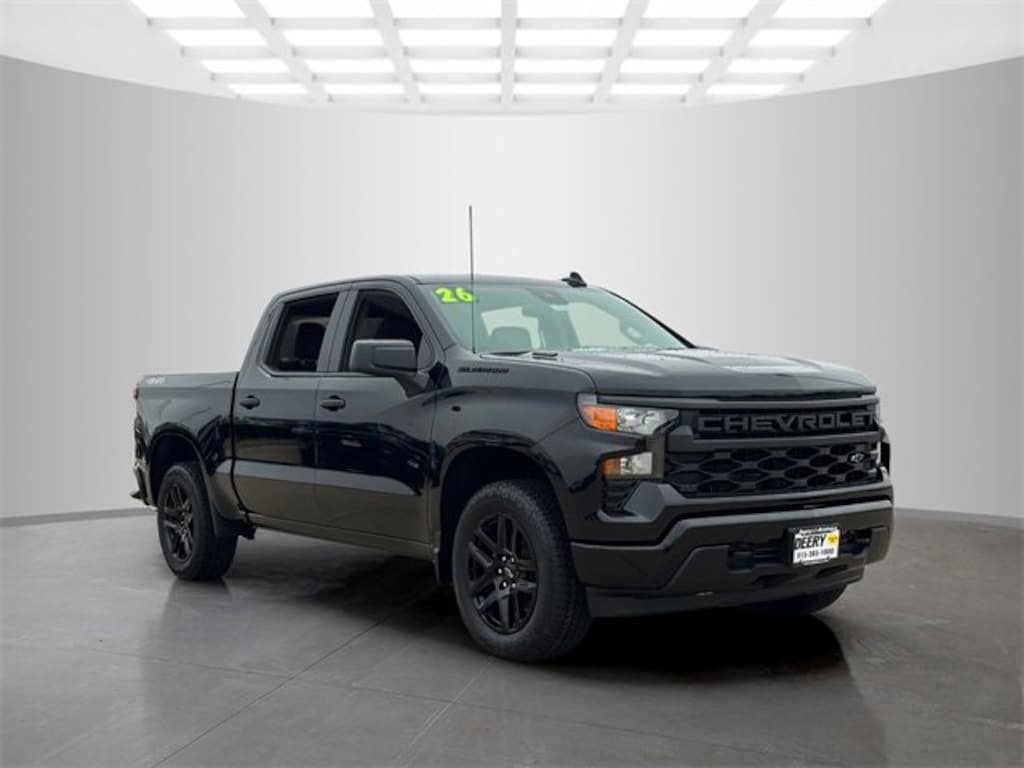 Black 2026 Chevrolet Custom Convenience Package (Electric Rear-Window Defogger, EZ Lift Power Lock & Release Tailgate, LED Cargo Area Lighting, Remote Vehicle Starter System, and Theft Deterrent System (Unauthorized Entry)), Custom Value Package, Dark Essentials Package (LPO) (Black Name Plates (LPO)), High Capacity Suspension Package, Trailering Package (Hitch Guidance), 10-Way Power Driver Seat w/Lumbar, 120-Volt Bed Mounted Power Outlet, 120-Volt Interior Power Outlet, 3.42 Rear Axle Ratio, 3.5 Monochromatic Display Driver Info Center, 4-Wheel Disc Brakes, 40/20/40 Front Split-Bench Seat, 6 Speakers, 6-Speaker Audio System, ABS brakes, Air Conditioning, All-Weather Floor Liner (LPO), Alloy wheels, AM/FM radio: SiriusXM, Apple CarPlay/Android Auto, Auto High-beam Headlights, Automatic Emergency Braking, Bluetooth® For Phone, Brake assist, Bumpers: body-color, Chevytec Spray-On Black Bedliner, Cloth Seat Trim, Color-Keyed Carpeting Floor Covering, Compass, Deep-Tinted Glass, Delay-off headlights, Driver door bin, Driver vanity mirror, Dual front impact airbags, Dual front side impact airbags, Dual Rear USB Ports (Charge Only), Electronic Cruise Control, Electronic Stability Control, Emergency communication system: OnStar, Following Distance Indicator, Forward Collision Alert, Front anti-roll bar, Front Center Armrest w/Storage, Front Frame-Mounted Black Recovery Hooks, Front Pedestrian Braking, Front reading lights, Front Rubberized Vinyl Floor Mats, Front wheel independent suspension, Fully automatic headlights, HD Rear Vision Camera, Heated door mirrors, Illuminated entry, IntelliBeam Automatic High Beam On/Off, Lane Keep Assist w/Lane Departure Warning, Low tire pressure warning, Manual Tilt Wheel Steering Column, Occupant sensing airbag, OnStar Services Capable, Outside temperature display, Overhead airbag, Overhead console, Panic alarm, Passenger door bin, Passenger vanity mirror, Power door mirrors, Power driver seat, Power Front Windows w/Driver Express Up/Down, Power Front Windows w/Passenger Express Down, Power Rear Windows w/Express Down, Power steering, Power windows, Premium audio system: Chevrolet Infotainment 3, Radio data system, Radio: Chevrolet Infotainment 3 System, Rear 60/40 Folding Bench Seat (Folds Up), Rear reading lights, Rear Rubberized-Vinyl Floor Mats, Rear step bumper, Rear Wheelhouse Liners, Rear window defroster, Remote Keyless Entry, Remote keyless entry, Security system, SiriusXM Trial Subscription, Speed control, Speed-sensing steering, Split folding rear seat, Standard Tailgate, Tachometer, Teen Driver, Tilt steering wheel, Tire Pressure Monitoring System, Traction control, Trip computer, Variably intermittent wipers, Voltmeter, Wheels: 20 x 9 Bright Silver Painted Aluminum, Wheels: 20 x 9 High Gloss Black Painted Alum, and Wi-Fi Hot Spot Capable. Silverado 1500 4D Crew Cab Custom 2.7L I4 Turbocharged DOHC 16V LEV3-SULEV30 310hp 17/21 City/Highway MPG 8-Speed Automatic 4WD Price includes: $1000 - Bonus Cash. Exp. 01/02/2026 $3000 - Customer Cash. Exp. 01/02/2026