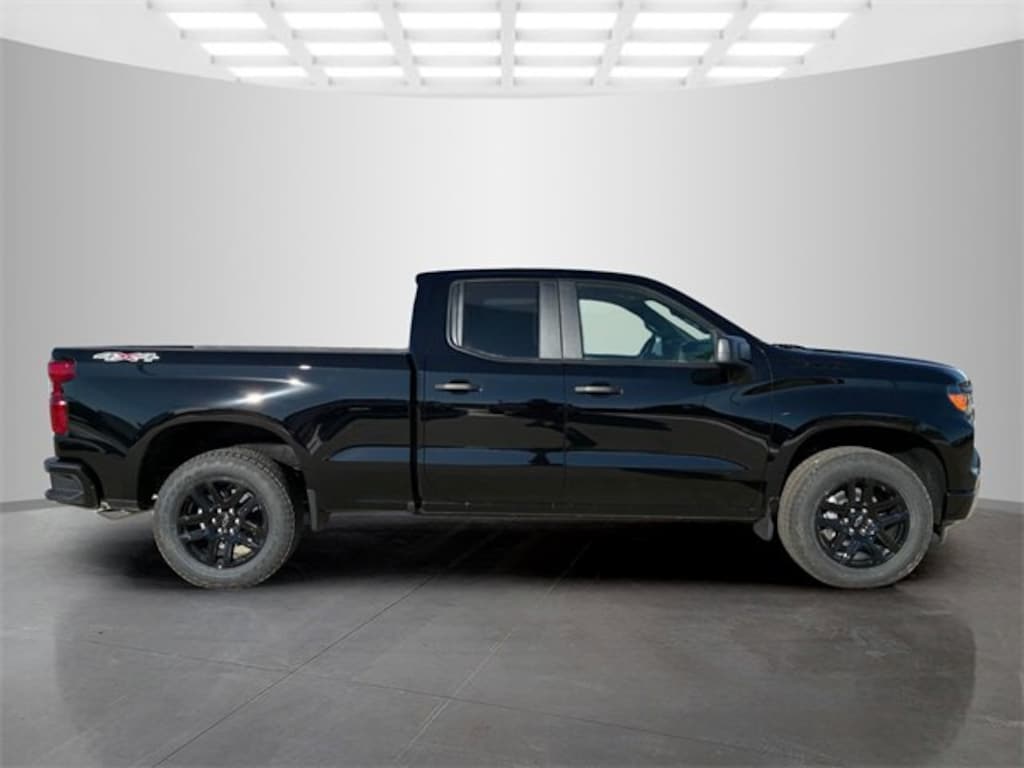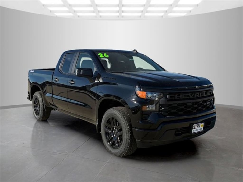 Black 2026 Chevrolet Custom Convenience Package (Electric Rear-Window Defogger, EZ Lift Power Lock and Release Tailgate, LED Cargo Area Lighting, Remote Vehicle Starter System, and Theft Deterrent System (unauthorized Entry)), Custom Value Package, Dark Essentials Package (Black Name Plates, Black Tailgate CHEVROLET Lettering, and Front Black Bowtie Emblem), High Capacity Suspension Package, Preferred Equipment Group 1CX (10-Way Power Driver Seat with Lumbar, 120-Volt Bed Mounted Power Outlet, 120-Volt Interior Power Outlet, 3.5 Monochromatic Display Driver Info Center, 40/20/40 Front Split-Bench Seat, Bluetooth® For Phone, Cloth Seat Trim, Color-Keyed Carpeting Floor Covering, Deep-Tinted Glass, Dual Rear USB Ports (charge Only), Electronic Cruise Control, Front Frame-Mounted Black Recovery Hooks, Front Rubberized Vinyl Floor Mats, HD Rear Vision Camera, Manual Tilt Wheel Steering Column, OnStar Services Capable, Power Front Windows with Driver Express Up/Down, Power Front Windows with Passenger Express Down, Power Rear Windows with Express Down, Rear 60/40 Folding Bench Seat (folds Up), Rear Rubberized-Vinyl Floor Mats, Remote Keyless Entry, SiriusXM Trial Subscription, Standard Tailgate, Teen Driver, Tire Pressure Monitoring System, and Wi-Fi Hot Spot Capable), Trailering Package (Hitch Guidance), 3.42 Rear Axle Ratio, 4-Wheel Disc Brakes, 6 Speakers, 6-Speaker Audio System, ABS brakes, Air Conditioning, All-Weather Floor Liner, Alloy wheels, AM/FM radio: SiriusXM, Apple CarPlay/Android Auto, Auto High-beam Headlights, Automatic Emergency Braking, Brake assist, Bumpers: body-color, Chevytec Spray-on Black Bedliner, Compass, Delay-off headlights, Driver door bin, Driver vanity mirror, Dual front impact airbags, Dual front side impact airbags, Electronic Stability Control, Emergency communication system: OnStar, Following Distance Indicator, Forward Collision Alert, Front anti-roll bar, Front Center Armrest w/Storage, Front License Plate Kit, Front Pedestrian Braking, Front reading lights, Front wheel independent suspension, Fully automatic headlights, Heated door mirrors, Illuminated entry, IntelliBeam Automatic High Beam on/Off, Lane Keep Assist with Lane Departure Warning, Low tire pressure warning, Occupant sensing airbag, Outside temperature display, Overhead airbag, Overhead console, Panic alarm, Passenger door bin, Passenger vanity mirror, Power door mirrors, Power driver seat, Power steering, Power windows, Premium audio system: Chevrolet Infotainment 3, Radio data system, Radio: Chevrolet Infotainment 3 System, Rear reading lights, Rear step bumper, Rear Wheelhouse Liners, Rear window defroster, Remote keyless entry, Security system, Speed control, Speed-sensing steering, Split folding rear seat, Tachometer, Tilt steering wheel, Traction control, Trip computer, Variably intermittent wipers, Voltmeter, Wheels: 20 x 9 Bright Silver Painted Aluminum, and Wheels: 20 x 9 High Gloss Black Painted Aluminum. Silverado 1500 4D Extended Cab Custom 2.7L I4 Turbocharged DOHC 16V LEV3-SULEV30 310hp 17/21 City/Highway MPG 8-Speed Automatic 4WD Price includes: $1000 - Bonus Cash. Exp. 03/02/2026 $3000 - Customer Cash. Exp. 03/02/2026 $1,000 - Exp. 09/30/2026$1,000 DEERY TRADE ASSIST FOR QUAILIFIED TRADES INS. CALL STORE FOR DETAILS