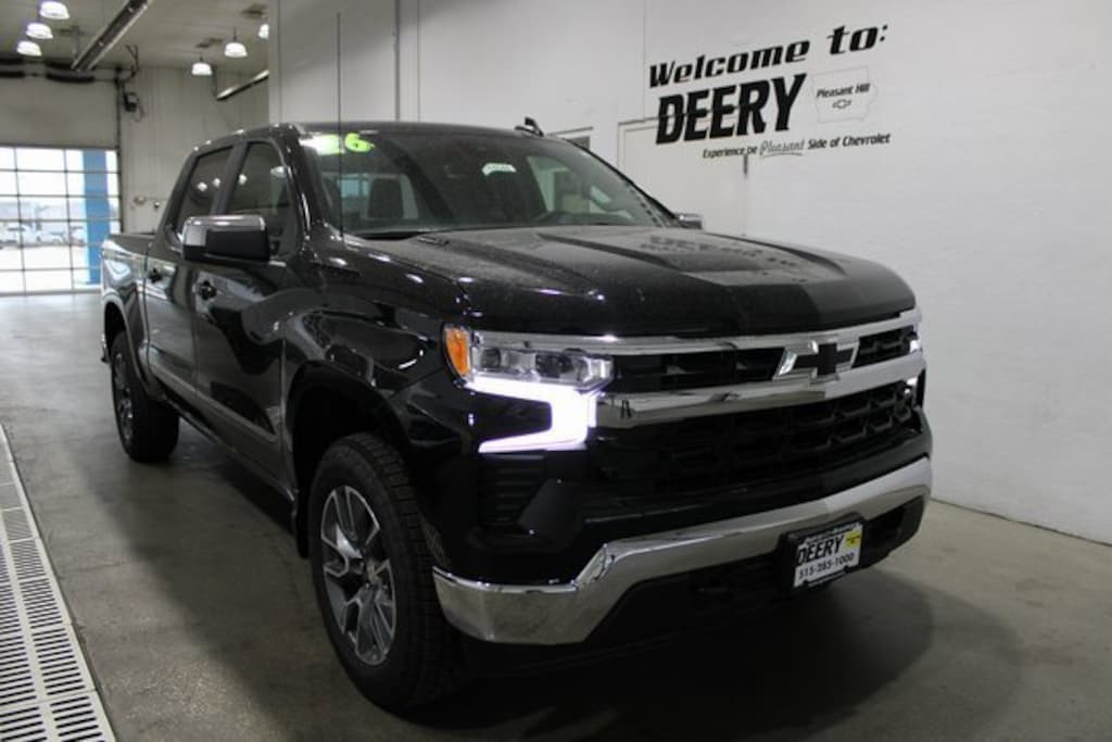 Black 2026 Chevrolet Convenience Package (10-Way Power Driver Seat w/Lumbar, 120-Volt Bed Mounted Power Outlet, 120-Volt Interior Power Outlet, Dual Rear USB Ports (Charge Only), Dual-Zone Automatic Climate Control, Heated Driver & Front Outboard Passenger Seats, Heated Steering Wheel, Keyless Open & Start, LED Cargo Area Lighting, Manual Tilt/Telescoping Steering Column, and Wrapped Steering Wheel), High Capacity Suspension Package, Standard Suspension Package, Trailering Package (Hitch Guidance), 12.3 Multicolor Reconfigurable Digital Display, 3.42 Rear Axle Ratio, 4-Wheel Disc Brakes, 40/20/40 Front Split-Bench Seat, 6 Speakers, 6-Speaker Audio System, ABS brakes, Air Conditioning, All-Star Edition, Alloy wheels, AM/FM radio: SiriusXM with 360L, Apple CarPlay/Android Auto, Auto High-beam Headlights, Auto-Locking Rear Differential, Automatic Emergency Braking, Automatic temperature control, Bluetooth® For Phone, Brake assist, Bumpers: chrome, Chrome Mirror Caps, Cloth Seat Trim, Color-Keyed Carpeting Floor Covering, Compass, Deep-Tinted Glass, Delay-off headlights, Driver door bin, Driver vanity mirror, Dual front impact airbags, Dual front side impact airbags, Electric Rear-Window Defogger, Electronic Cruise Control, Electronic Stability Control, Emergency communication system: OnStar, Following Distance Indicator, Forward Collision Alert, Front anti-roll bar, Front Center Armrest w/Storage, Front dual zone A/C, Front Frame-Mounted Black Recovery Hooks, Front License Plate Kit, Front Pedestrian Braking, Front reading lights, Front wheel independent suspension, Fully automatic headlights, HD Rear Vision Camera, Heated door mirrors, Heated front seats, Heated steering wheel, Illuminated entry, Integrated Trailer Brake Controller, IntelliBeam Automatic High Beam On/Off, Lane Keep Assist w/Lane Departure Warning, Low tire pressure warning, Occupant sensing airbag, OnStar Services Capable, Outside temperature display, Overhead airbag, Overhead console, Panic alarm, Passenger door bin, Passenger vanity mirror, Power door mirrors, Power driver seat, Power Front Windows w/Driver Express Up/Down, Power Front Windows w/Passenger Express Down, Power Rear Windows w/Express Down, Power steering, Power windows, Premium audio system: Chevrolet Infotainment 3 Premium, Radio data system, Radio: Chevrolet Infotainment 3 Premium System, Rear 60/40 Folding Bench Seat (Folds Up), Rear reading lights, Rear step bumper, Rear window defroster, Remote keyless entry, Remote Vehicle Starter System, Security system, SiriusXM w/360L Trial Subscription, Speed control, Speed-sensing steering, Split folding rear seat, Steering Wheel Audio Controls, Steering wheel mounted audio controls, Tachometer, Teen Driver, Telescoping steering wheel, Theft Deterrent System (Unauthorized Entry), Tilt steering wheel, Tire Pressure Monitoring System, Traction control, Trip computer, Variably intermittent wipers, Voltmeter, Wheels: 18 x 8.5 Bright Silver Painted Aluminum, Wheels: 20 x 9 Painted Aluminum, and Wi-Fi Hot Spot Capable. Silverado 1500 4D Crew Cab LT LT1 2.7L I4 Turbocharged DOHC 16V LEV3-SULEV30 310hp 17/20 City/Highway MPG 8-Speed Automatic 4WD Price includes: $1000 - Bonus Cash. Exp. 11/03/2025 $1750 - Customer Cash. Exp. 11/03/2025 $1,000 Trade Allowance. Please call dealer for more qualifying details. - Exp. 01/01/2026