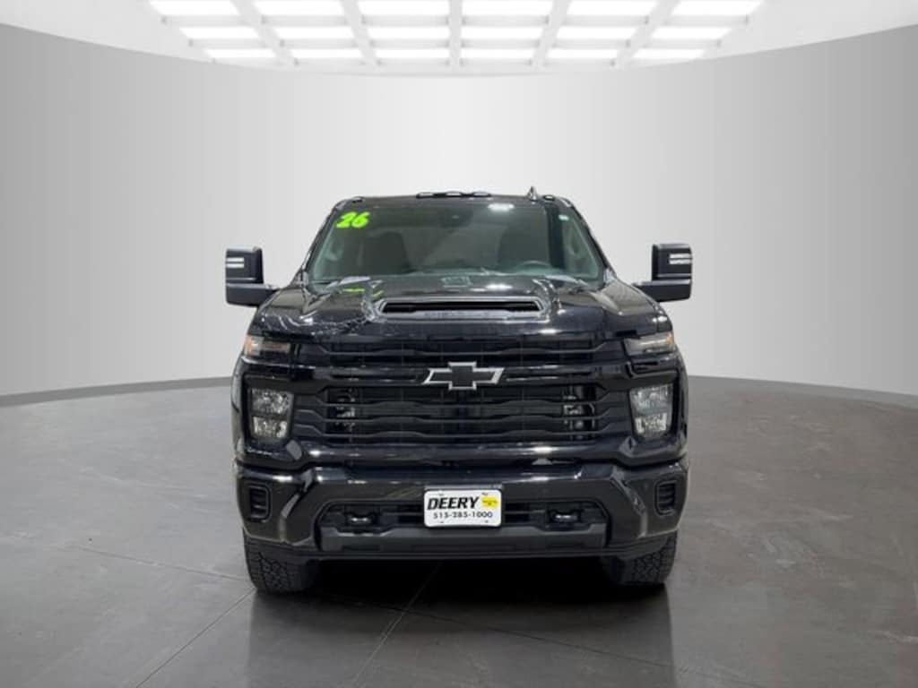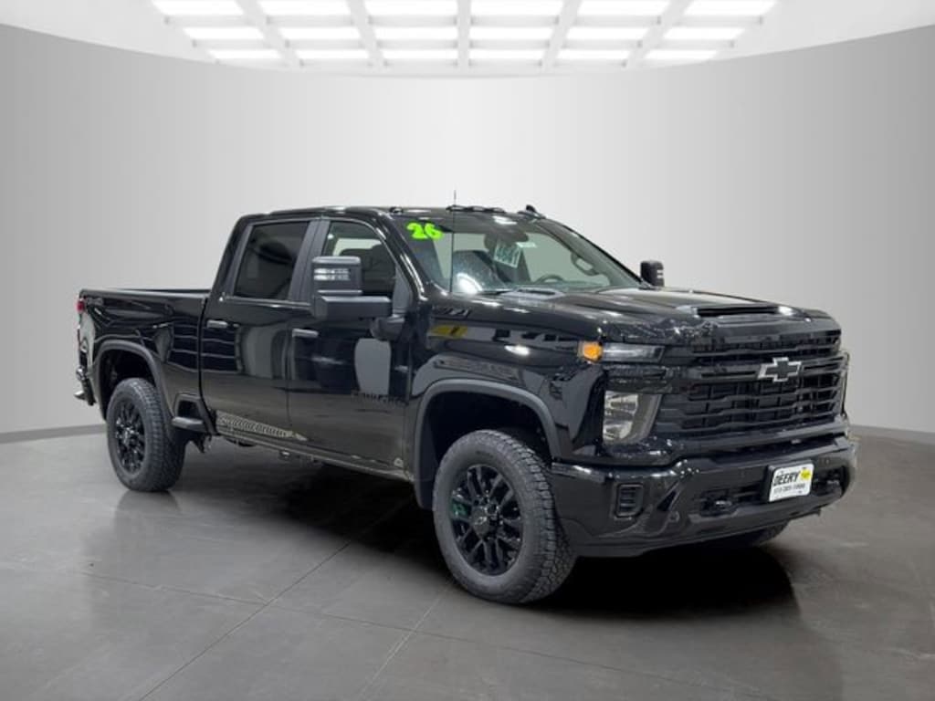 Black 2026 Chevrolet Custom Blackout Package (Wheels: 20 High Gloss Black Painted), Custom Convenience Package (10-Way Power Driver Seat Adjuster with Lumbar, 120-Volt Bed Mounted Power Outlet, 120-Volt Interior Power Outlet, Dual Rear USB Ports (charge Only), Electric Rear-Window Defogger, EZ Lift Power Lock and Release Tailgate, LED Cargo Area Lighting, Remote Vehicle Starter System, and Unauthorized Entry Theft-Deterrent System), Custom Value Package (Auto-Dimming Inside Rear-View Mirror and Heated and Auto-Dimming Vertical Trailering Mirrors), CX Safety Package (Lane Change Alert with Side Blind Zone Alert, Rear Cross Traffic Alert, and Ultrasonic Front and Rear Park Assist), Gooseneck/5th Wheel Prep Package (Black Chevytec Spray-on Bedliner), Snow Plow Prep/Camper Package (220 Amp Alternator), Suspension Package, Z71 Off-Road Package (Hill Descent Control and Off-Road Suspension), 170 Amp Alternator, 2-Speed Electronic Shift Transfer Case, 3.5 Diagonal Monochromatic Display DIC, 4-Wheel Disc Brakes, 6 Speakers, 6-Speaker Audio System, 720 Cold-Cranking Amps Heavy-Duty Battery, ABS brakes, Air Conditioning, Alloy wheels, AM/FM radio: SiriusXM with 360L, Apple CarPlay/Android Auto, Auto High-beam Headlights, Black Mirror Caps, Black Tailgate Lettering, Bluetooth® For Phone, Brake assist, Chevrolet Connected Access Capable, Cloth Seat Trim, Color-Keyed Carpeting Floor Covering, Compass, Deep-Tinted Glass, Delay-off headlights, Driver door bin, Dual front impact airbags, Dual front side impact airbags, Durabed Pickup Bed, Electronic Cruise Control with Set and Resume Speed, Electronic Stability Control, Emergency communication system: OnStar, Front 40/20/40 Split-Bench Seats with Lockable Storage, Front anti-roll bar, Front Center Armrest w/Storage, Front reading lights, Front Rubberized Vinyl Floor Mats, Front wheel independent suspension, Fully automatic headlights, HD Rear Vision Camera, Heated door mirrors, Heated Vertical Trailering Mirrors, Illuminated entry, LED Smoked Amber Roof Marker Lamps, Locking Tailgate, Low tire pressure warning, Manual Tailgate Function with No EZ Lift, Manual Tilt-Wheel Steering Column, Occupant sensing airbag, OnStar Services Capable, Outside temperature display, Overhead airbag, Overhead console, Panic alarm, Passenger door bin, Passenger vanity mirror, Power Door Locks, Power door mirrors, Power Front Windows with Driver Express Up/Down, Power Front Windows with Passenger Express Down, Power Rear Windows with Express Down, Power steering, Power windows, Premium audio system: Chevrolet Infotainment 3, Push Button Start, Radio: Chevrolet Infotainment 3 System, Rear 60/40 Folding Bench Seat (folds Up), Rear reading lights, Rear Rubberized Vinyl Floor Mats, Rear step bumper, Remote Keyless Entry, Remote keyless entry, SiriusXM with 360L Trial Subscription, Speed control, Split folding rear seat, Standard Tailgate, Tachometer, Tilt steering wheel, Traction control, Trip computer, Turn signal indicator mirrors, Variably intermittent wipers, Voltmeter, Wheels: 20 10-Spoke Machined Aluminum, Wi-Fi Hotspot Capable, and Wireless Phone Projection. Silverado 2500HD 4D Crew Cab Custom Duramax 6.6L V8 Turbodiesel 10-Speed Automatic 4WD Price includes: $1000 - Customer Cash. Exp. 04/30/2026 $2,000 - Exp. 06/30/2026$2,000 - $ExpDate$2,000 - $ExpDate$1,000 DEERY TRADE ASSIST FOR QUAILIFIED TRADES INS. CALL STORE FOR DETAILS