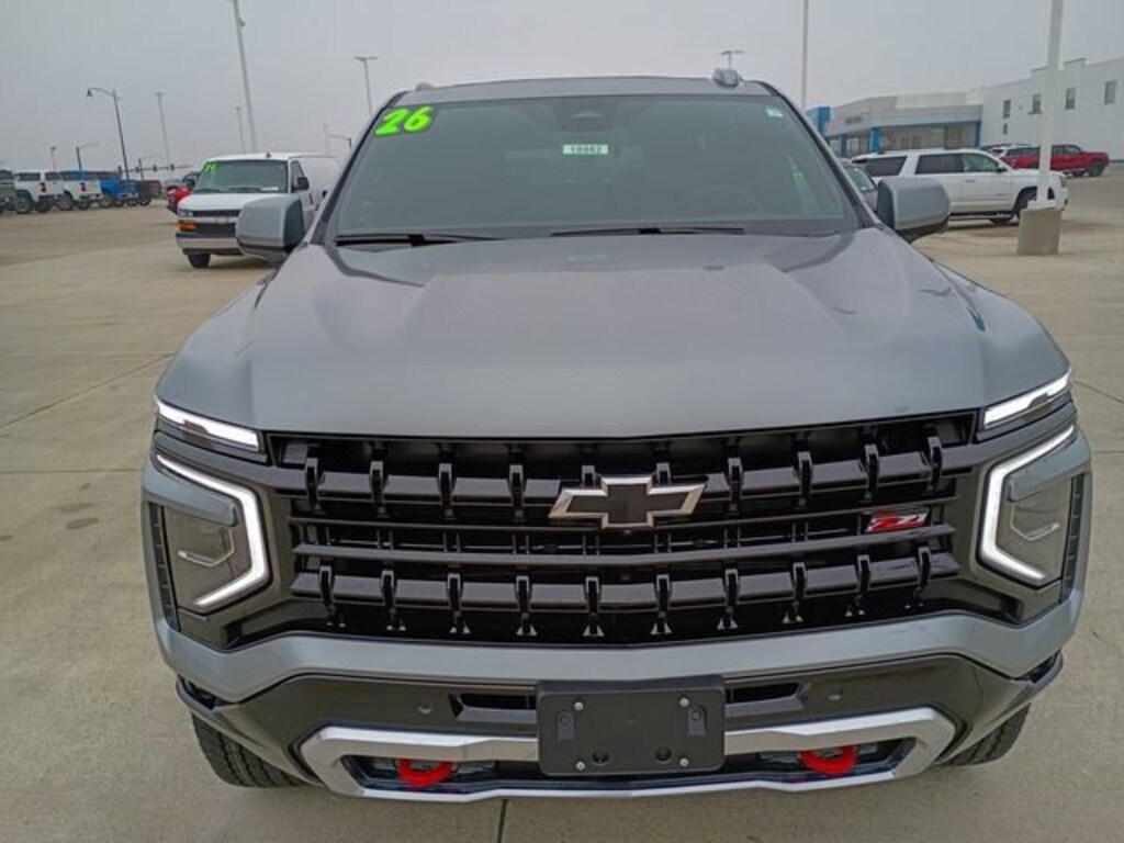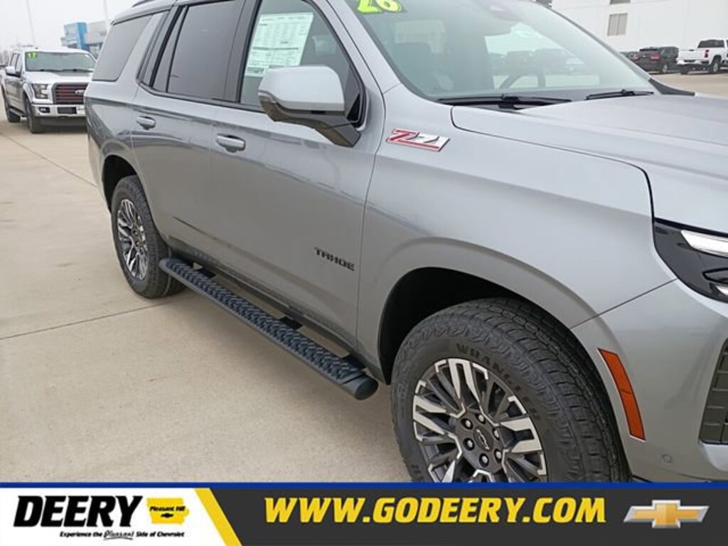 Sterling Gray Metallic 2026 Chevrolet Comfort Package (2nd Row Power Release 60/40 Split-Folding Bench Seat, 3rd Row 60/40 Power-Folding Split-Bench Seat, Bose 10-Speaker Centerpoint Surround Audio System Feature, Heated 2nd Row Outboard Seats, Heated Steering Wheel, LED Headlamps with LED Daytime Running Lamps, LED Tail Lamps, Memory Settings, and Outside Heated Power-Adjustable Mirrors), Premium Liner Protection Package (3rd Row All-Weather Floor Liners, All-Weather Cargo Mat, and First and Second Rows Premium Floor Liners), 1st and 2nd Row Color-Keyed Carpeted Floor Mats, 2-Speed Active Electronic AutoTrac Transfer Case, 2-Way Power Driver Lumbar Seat Adjuster, 2-Way Power Front Passenger Lumbar Seat Adjuster, 3-Spoke Wrapped Steering Wheel, 3.23 Rear Axle Ratio, 3rd Row Manual 60/40 Split-Folding Bench Seats, 3rd row seats: split-bench, 4-Wheel Disc Brakes, 6 Speakers, 6-Speaker Audio System Feature, 8-Way Power Driver Seat Adjuster, 8-Way Power Front Passenger Seat Adjuster, ABS brakes, Air Conditioning, Alloy wheels, AM/FM radio: SiriusXM with 360L, Apple CarPlay/Android Auto, Auto High-beam Headlights, Auto-Dimming Inside Rear-View Mirror, Auto-dimming Rear-View mirror, Automatic temperature control, Black Tubular Assist Steps, Brake assist, Bright Front and Rear Door Sill Plates, Bumpers: body-color, Color-Keyed Carpeting Floor Covering, Compass, Delay-off headlights, Driver door bin, Driver vanity mirror, Dual Exhaust System, Dual front impact airbags, Dual front side impact airbags, Dual-Pane Power Panoramic Sunroof, Electronic Stability Control, Emergency communication system: OnStar and Chevrolet connected services capable, Exterior Parking Camera Rear, Floor Console with Storage Area, Four wheel independent suspension, Front anti-roll bar, Front Bucket Seats, Front Center Armrest, Front dual zone A/C, Front fog lights, Front High-Approach Angle Fascia, Front LED Fog Lamps, Front reading lights, Frontal Driver and Outboard Passenger Airbags, Fully automatic headlights, Garage door transmitter, Heated door mirrors, Heated Driver and Front Passenger Seats, Heated front seats, Hill Descent Control, Illuminated entry, Interior Camera, Key Card, Leather-Appointed Seat Trim, Low tire pressure warning, Memory seat, Memory Settings For Driver, Navigation system: Google built-in compatibility (select service plan required, terms and limitations apply), Occupant sensing airbag, Outside temperature display, Overhead airbag, Overhead console, Panic alarm, Passenger door bin, Passenger vanity mirror, Power door mirrors, Power driver seat, Power Liftgate, Power passenger seat, Power Release 2nd Row Bucket Seats, Power steering, Power windows, Premium audio system: Chevrolet Infotainment 3 Premium, Premium Smooth Ride Suspension, Radio data system, Radio: 17.7 Diagonal Advanced Color LCD Display, Rain sensing wipers, Rear air conditioning, Rear anti-roll bar, Rear Power Liftgate, Rear reading lights, Rear seat center armrest, Rear window defroster, Rear window wiper, Red Horizontal-Mounted Recovery Hooks, Remote keyless entry, Remote Start, Security system, SiriusXM with 360L Trial Subscription, Speed control, Speed-sensing steering, Split folding rear seat, Spoiler, Steering wheel mounted audio controls, Tachometer, Telescoping steering wheel, Tilt steering wheel, Traction control, Trip computer, Universal Home Remote, USB Ports, Variably intermittent wipers, Voltmeter, Wheels: 20 x 9 Bright Machined Aluminum, Wireless Phone Charging, and Z71 Exterior Features. Tahoe 4D Sport Utility Z71 EcoTec3 5.3L V8 15/19 City/Highway MPG 10-Speed Automatic with Overdrive 4WD Price includes: $1,000 - Exp. 09/30/2026$1,000 DEERY TRADE ASSIST FOR QUAILIFIED TRADES INS. CALL STORE FOR DETAILS