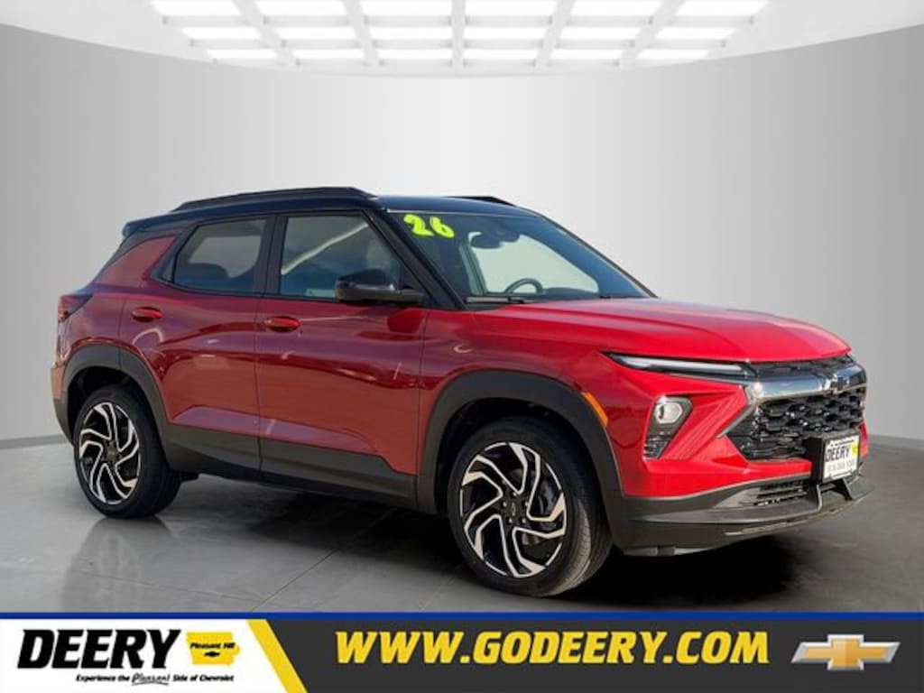 Apex Red 2026 Chevrolet Adaptive Cruise and Sound Package (Adaptive Cruise Control and Bose Premium 7-Speaker Audio System Feature), Convenience Package (1 Type-An and 1 Type-C USB Charging-Only Ports, 120-Volt Power Outlet, Cabin Humidity Sensor, Driver and Front Passenger Illuminated Vanity Mirrors, Hands Free Power Programmable Liftgate, Inside Rear-View Auto-Dimming Mirror, Single-Zone Automatic Climate Control, and Wireless Charging), Driver Confidence Package (Lane Change Alert with Side Blind Zone Alert, Rear Cross Traffic Alert, and Rear Park Assist), 1 Type-An and 1 Type-C USB Ports, 2-Way Power Driver Lumbar Seat Adjuster, 3.17 Final Drive Axle Ratio, 4-Way Manual Front Passenger Seat Adjuster, 4-Wheel Disc Brakes, 6 Speakers, 6-Speaker Audio System Feature with Amplifier, 8-Way Power Driver Seat Adjuster, ABS brakes, Air Conditioning, Alloy wheels, AM/FM radio: SiriusXM, Auto High-beam Headlights, Brake assist, Bumpers: body-color, Compass, Delay-off headlights, Driver door bin, Driver vanity mirror, Dual front impact airbags, Dual front side impact airbags, Dual-Pane Panoramic Power Sunroof, Electronic Stability Control, Emergency communication system: OnStar and Chevrolet connected services capable, Evotex Seat Trim, Exterior Parking Camera Rear, Flat-Folding Front Passenger Seatback, Front and Rear All-Weather Floor Liners, Front anti-roll bar, Front Bucket Seats, Front Center Armrest, Front reading lights, Front wheel independent suspension, Fully automatic headlights, Heated door mirrors, Heated Driver and Front Passenger Seats, Heated front seats, Heated steering wheel, Illuminated entry, Knee airbag, Low tire pressure warning, Occupant sensing airbag, Overhead airbag, Overhead console, Panic alarm, Passenger door bin, Passenger vanity mirror, Power door mirrors, Power driver seat, Power steering, Power windows, Radio data system, Radio: AM/FM Stereo Audio System, Rear seat center armrest, Rear side impact airbag, Rear window defroster, Rear window wiper, Remote keyless entry, Ride and Handling Suspension, Security system, SiriusXM Trial Subscription, Speed control, Split folding rear seat, Spoiler, Steering wheel mounted audio controls, Tachometer, Telescoping steering wheel, Tilt steering wheel, Traction control, Trip computer, Variably intermittent wipers, Wheels: 19 High Gloss Black Machined Aluminum, and Wireless Apple CarPlay/Android Auto. TrailBlazer 4D Sport Utility RS 1.3L I3 Turbocharged DOHC 12V LEV3-SULEV30 155hp 26/29 City/Highway MPG 9-Speed Automatic AWD Price includes: $3,000 - Exp. 06/30/2026$3,000 - $ExpDate$3,000 - $ExpDate$1,000 DEERY TRADE ASSIST FOR QUAILIFIED TRADES INS. CALL STORE FOR DETAILS