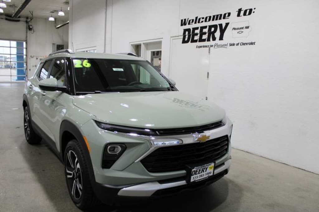 Cacti Green 2026 Chevrolet Adaptive Cruise Control Package (Adaptive Cruise Control), Convenience Package (1 Type-A & 1 Type-C USB Charging-Only Ports, 120-Volt Power Outlet, 2-Way Power Driver Lumbar Seat Adjuster, 8-Way Power Driver Seat Adjuster, Cabin Humidity Sensor, Dr & Fr Passenger Illuminated Vanity Mirrors, Inside Rear-View Auto-Dimming Mirror, Power Liftgate, Rear Center Armrest, Single-Zone Automatic Climate Control, and Wireless Charging), Driver Confidence Package (Lane Change Alert w/Side Blind Zone Alert, Rear Cross Traffic Alert, and Rear Park Assist), LT Cold Weather Package (Heated Driver & Front Passenger Seats, Heated Steering Wheel, Satin Silver & Chrome Wrapped Shift Knob, and Wrapped Steering Wheel), Preferred Equipment Group 1LT, 1 Type-A & 1 Type-C USB Ports, 3.17 Final Drive Axle Ratio, 4-Way Manual Front Passenger Seat Adjuster, 4-Wheel Disc Brakes, 6 Speakers, 6-Speaker Audio System Feature w/Amplifier, 6-Way Manual Driver Seat Adjuster, ABS brakes, Air Conditioning, Alloy wheels, AM/FM radio: SiriusXM, Auto High-beam Headlights, Brake assist, Bumpers: body-color, Cloth Seat Trim, Compass, Delay-off headlights, Driver door bin, Driver vanity mirror, Dual front impact airbags, Dual front side impact airbags, Electronic Stability Control, Emergency communication system: OnStar and Chevrolet connected services capable, Exterior Parking Camera Rear, Flat-Folding Front Passenger Seatback, Front & Rear All-Weather Floor Liners (LPO), Front anti-roll bar, Front Bucket Seats, Front Center Armrest, Front License Plate Bracket, Front reading lights, Front wheel independent suspension, Fully automatic headlights, Heated door mirrors, Illuminated entry, Knee airbag, Low tire pressure warning, Mechanical Jack w/Tools, Occupant sensing airbag, Overhead airbag, Overhead console, Panic alarm, Passenger door bin, Passenger vanity mirror, Power door mirrors, Power steering, Power windows, Radio data system, Radio: AM/FM Stereo Audio System, Rear side impact airbag, Rear window defroster, Rear window wiper, Remote keyless entry, Ride & Handling Suspension, Security system, SiriusXM Trial Subscription, Speed control, Split folding rear seat, Spoiler, Steering wheel mounted audio controls, Tachometer, Telescoping steering wheel, Tilt steering wheel, Traction control, Trip computer, Variably intermittent wipers, Wheels: 17 High Gloss Black Machined Aluminum, Wheels: 18 High Gloss Black Machined Aluminum, and Wireless Apple CarPlay/Android Auto. TrailBlazer 4D Sport Utility LT 1.3L Ecotec Turbo DOHC SIDI w/VVT 26/29 City/Highway MPG 9-Speed Automatic AWD
