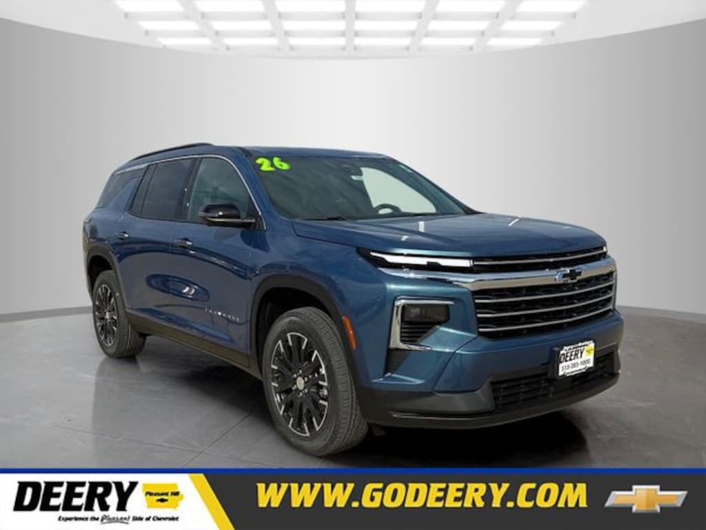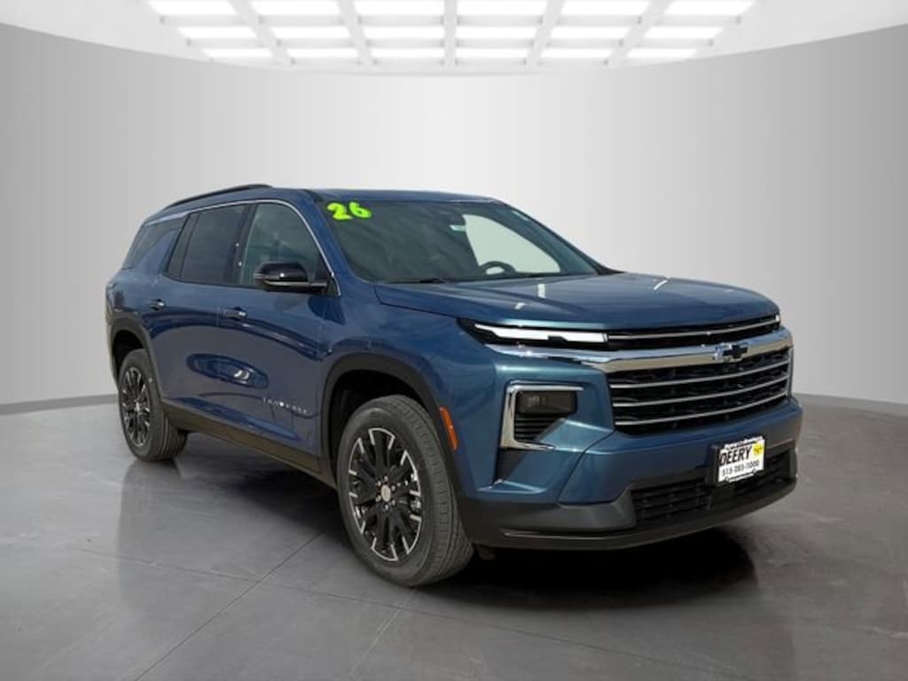 Lakeshore Blue Metallic 2026 Chevrolet Driver Confidence Package (HD Surround Vision, Key Card, Power Outlet, Rear Camera Mirror, Rear Pedestrian Alert, and Traffic Sign Recognition), Floor Liner Package (1st and 2nd Row All-Weather Floor Liners, 3rd Row All-Weather Floor Liner, and Integrated Cargo Liner), Preferred Equipment Group 2LT, Sun and Wheel Package (Power Dual Glass Panoramic Sliding Sunroof and Wheels: 20 Carbon Flash Metallic Aluminum), 3rd row seats: split-bench, 4-Way Manual Front Passenger Seat Adjuster, 4-Wheel Disc Brakes, 6 Speakers, 6-Speaker Audio System Feature, 8-Way Power Driver Seat Adjuster, ABS brakes, Air Conditioning, Alloy wheels, AM/FM radio: SiriusXM with 360L, Apple CarPlay/Android Auto, Auto High-beam Headlights, Automatic temperature control, Black Bowtie, Brake assist, Bumpers: body-color, Child-Seat-Sensing Airbag, Compass, Delay-off headlights, Driver door bin, Driver vanity mirror, Dual front impact airbags, Dual front side impact airbags, Electronic Stability Control, Emergency communication system: OnStar, Four wheel independent suspension, Front anti-roll bar, Front Bucket Seats, Front Center Armrest, Front dual zone A/C, Front reading lights, Fully automatic headlights, Heated door mirrors, Heated Driver and Front Passenger Seats, Heated front seats, Heated steering wheel, Illuminated entry, Low tire pressure warning, Navigation System, Occupant sensing airbag, Outside temperature display, Overhead airbag, Overhead console, Panic alarm, Passenger door bin, Passenger vanity mirror, Power door mirrors, Power driver seat, Power Liftgate, Power steering, Power windows, Premium Cloth Seat Trim, Radio data system, Radio: : Audio System w/17.7 Diagonal Display, Rear air conditioning, Rear anti-roll bar, Rear reading lights, Rear window defroster, Rear window wiper, Remote keyless entry, Security system, SiriusXM with 360L Trial Subscription, Speed control, Speed-sensing steering, Spoiler, Steering wheel mounted audio controls, Tachometer, Telescoping steering wheel, Tilt steering wheel, Traction control, Trip computer, Turn signal indicator mirrors, Variably intermittent wipers, Voltmeter, and Wheels: 18 Grazen Metallic Machined-Face Aluminum. Traverse 4D Sport Utility LT 2LT 2.5L DOHC 20/24 City/Highway MPG 8-Speed Automatic AWD