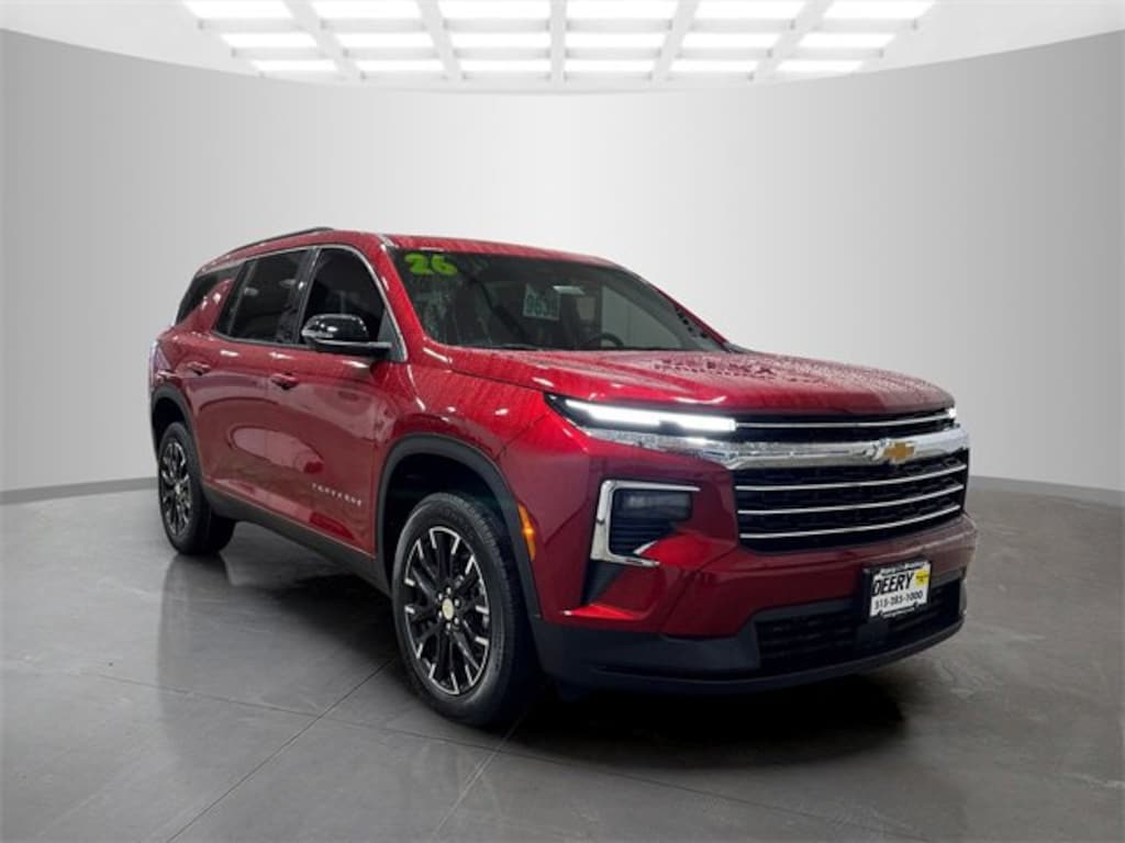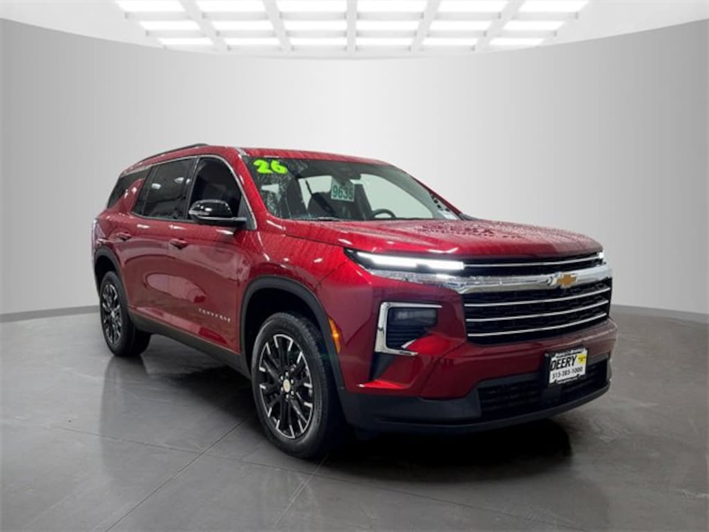 Radiant Red Tintcoat 2026 Chevrolet Driver Confidence Package (HD Surround Vision, Key Card, Power Outlet, Rear Camera Mirror, Rear Pedestrian Alert, and Traffic Sign Recognition), 3rd row seats: split-bench, 4-Way Manual Front Passenger Seat Adjuster, 4-Wheel Disc Brakes, 6 Speakers, 6-Speaker Audio System Feature, 8-Way Power Driver Seat Adjuster, ABS brakes, Air Conditioning, Alloy wheels, AM/FM radio: SiriusXM with 360L, Apple CarPlay/Android Auto, Auto High-beam Headlights, Automatic temperature control, Brake assist, Bumpers: body-color, Child-Seat-Sensing Airbag, Compass, Delay-off headlights, Driver door bin, Driver vanity mirror, Dual front impact airbags, Dual front side impact airbags, Electronic Stability Control, Emergency communication system: OnStar, Four wheel independent suspension, Front anti-roll bar, Front Bucket Seats, Front Center Armrest, Front dual zone A/C, Front reading lights, Fully automatic headlights, Heated door mirrors, Heated front seats, Heated steering wheel, Illuminated entry, Low tire pressure warning, Navigation System, Occupant sensing airbag, Outside temperature display, Overhead airbag, Overhead console, Panic alarm, Passenger door bin, Passenger vanity mirror, Power door mirrors, Power driver seat, Power Dual Glass Panoramic Sliding Sunroof, Power Liftgate, Power steering, Power windows, Premium Cloth Seat Trim, Radio data system, Rear air conditioning, Rear anti-roll bar, Rear reading lights, Rear window defroster, Rear window wiper, Remote keyless entry, Security system, Speed control, Speed-sensing steering, Spoiler, Steering wheel mounted audio controls, Tachometer, Telescoping steering wheel, Tilt steering wheel, Traction control, Trip computer, Turn signal indicator mirrors, Variably intermittent wipers, Voltmeter, Wheels: 18 Grazen Metallic Machined-Face Aluminum, and Wheels: 20 Carbon Flash Metallic Aluminum. Traverse 4D Sport Utility LT 2LT 2.5L DOHC 20/24 City/Highway MPG 8-Speed Automatic AWD Price includes: $1500 - Customer Cash. Exp. 01/02/2026